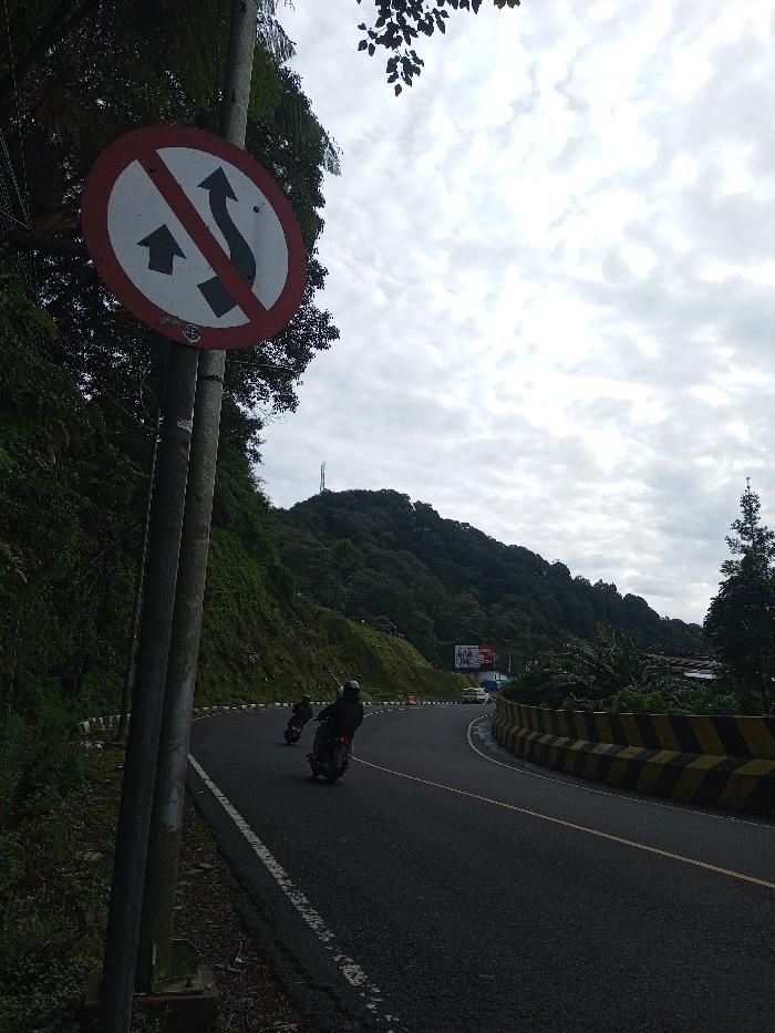 A winding mountain road with two motorcyclists driving on it. A road sign indicates no overtaking is permitted. The roadside has black and yellow barriers. Lush green foliage covers the hillside next to the road. Above the greenery, a mountain rises, topped with a tower-like structure. The sky is overcast with thick clouds.