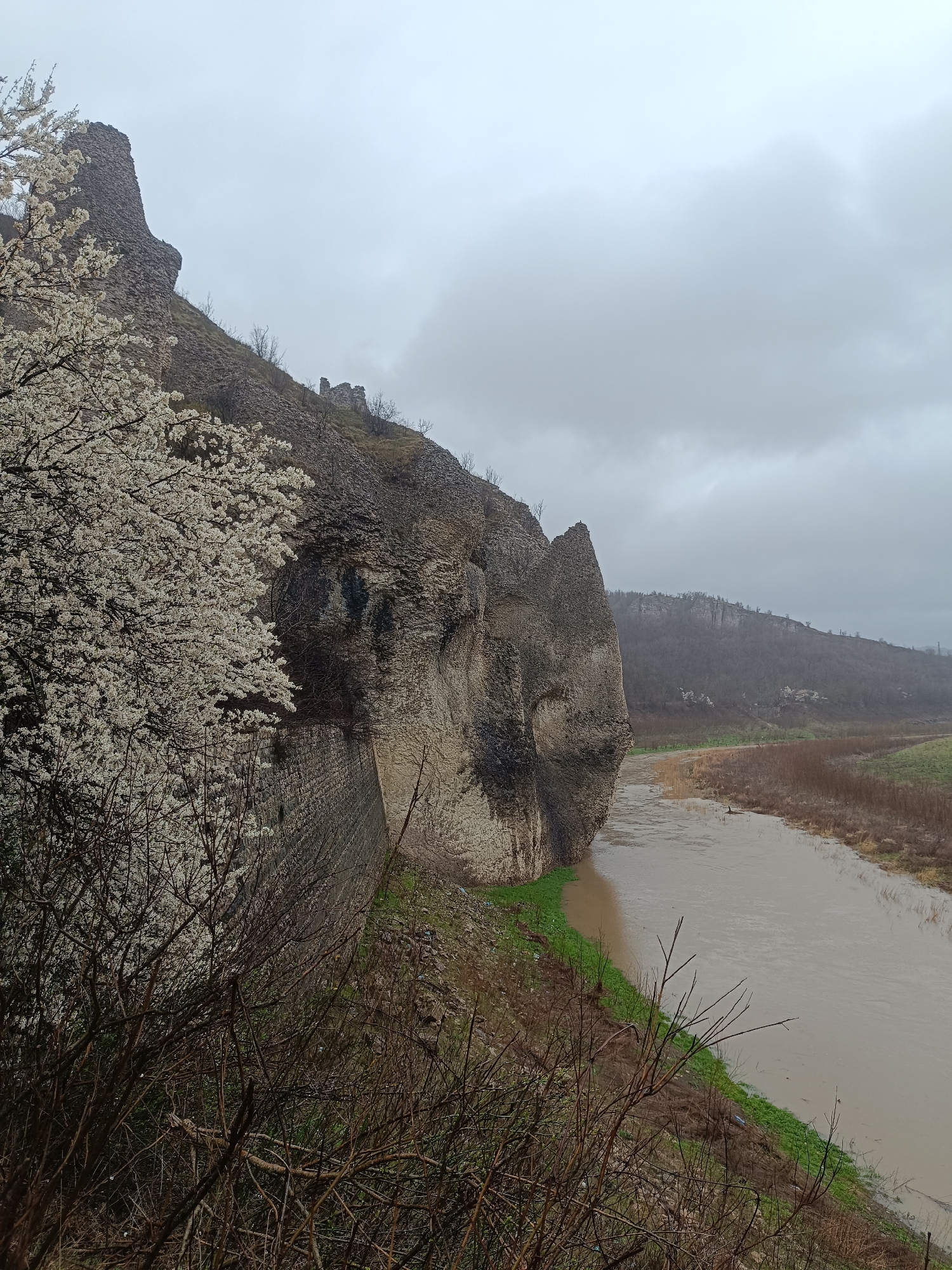 The image depicts a landscape scene near Asparuhovo, Bulgaria. A river with muddy brown water flows through a valley. On the left, a steep, rocky cliff rises, partially covered with vegetation and a tree blooming with white flowers. A stone wall runs along the base of the cliff. The sky is overcast and gray. In the background, a hill covered with bare trees can be seen on the right side of the river. There are no visible people or animals.