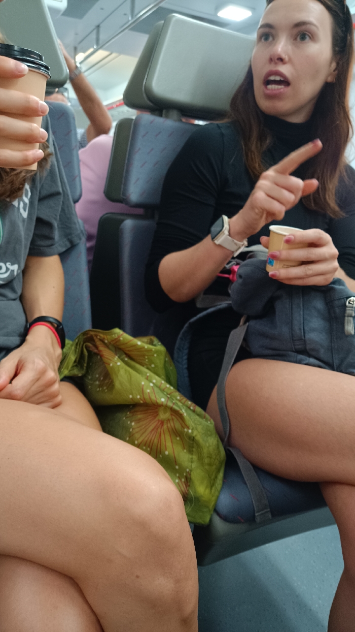The scene depicts the interior of a Metrovalencia train in Valencia, Spain. Two individuals are seated, with additional passengers partially visible in the background. In the midground, a woman with brown hair, wearing a black long-sleeved turtleneck top and dark shorts, is seated on the right. Her mouth is open, indicating speech, and her right index finger is pointed forward in an emphatic gesture. A white smartwatch is on her left wrist, and she holds a small, light brown disposable cup containing a pink substance in her left hand. Her fingernails are painted pink. A dark blue denim backpack with a silver zipper is positioned on her lap, and a green fabric item with a red circular pattern is draped over her left thigh. Partially visible in the foreground on the left, another individual wears a grey t-shirt and has light-skinned crossed legs. They hold a larger light brown disposable cup with a black lid in their right hand. A red and black wristband is on their left wrist. The train interior features blue upholstered seats with a subtle patterned fabric and grey plastic seatbacks. Overhead white lights illuminate the compartment. A person wearing a light pink top is partially visible in the background, behind the woman in black, and an arm reaching for an overhead handrail indicates another passenger standing further back.