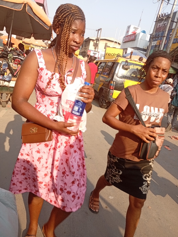 Two women are walking outside in what appears to be a busy market area. The woman on the left wears a pink floral dress with a brown cross-body bag and carries a water bottle. She has braided hair. The woman to her right wears a brown t-shirt, a black skirt with white swirls, and brown sandals. She also has a cross-body bag. A yellow van with a man gesturing from the open roof is visible in the background along with other pedestrians and market stalls.