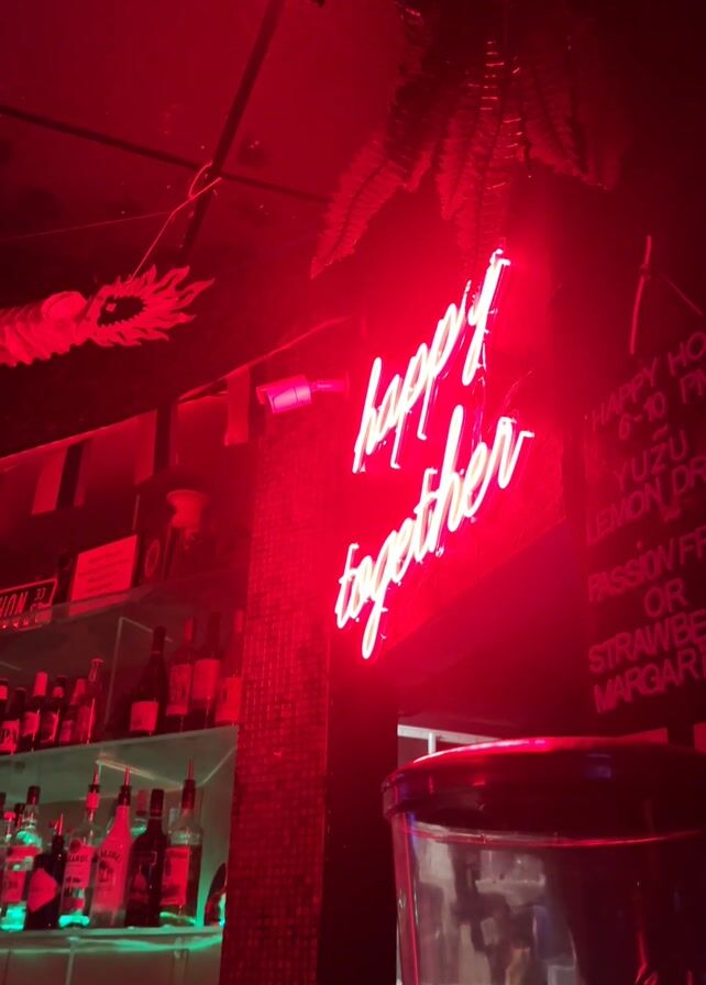 bar with a red neon sign that says "Happy Together