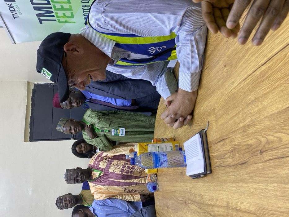 This image captures an indoor meeting or gathering in Rigachikun, Nigeria. In the foreground, a light-skinned male wearing a light blue striped collared shirt, a blue and yellow reflective safety vest with a white symbol on the left chest, and a black baseball cap with a white logo (possibly "TMD") is seated at a light brown wooden table. He is smiling broadly towards the left and has his hands clasped on the table. A plastic water bottle labeled "MT. V" stands on the table in front of him, alongside a closed black notebook with white pages containing text. Several beverage cartons and a metal can are also visible on the table. In the mid-ground and background, a group of approximately seven to eight individuals, predominantly of African descent, are standing. Most are looking towards the right side of the frame, some smiling. Notable figures include an older male in a light brown and purple traditional robe and cap, wearing a green lanyard with an ID card, who is smiling. Another male in a green traditional garment and cap, also with a green lanyard, smiles beside him. Behind these individuals, a male in a dark suit, tie, and a red cap stands with a more serious expression. Other individuals in various attire, including light blue and green shirts, and a woman with dark hair, are partially visible. To the right in the background, a white banner with green text is visible, displaying "TMDK agro-park" at the top and "TMDK FEED" below, followed by partially visible text indicating "TOP NOTCH Q". The environment features light-colored walls and a dark doorway in the background, suggesting an office or conference room setting.