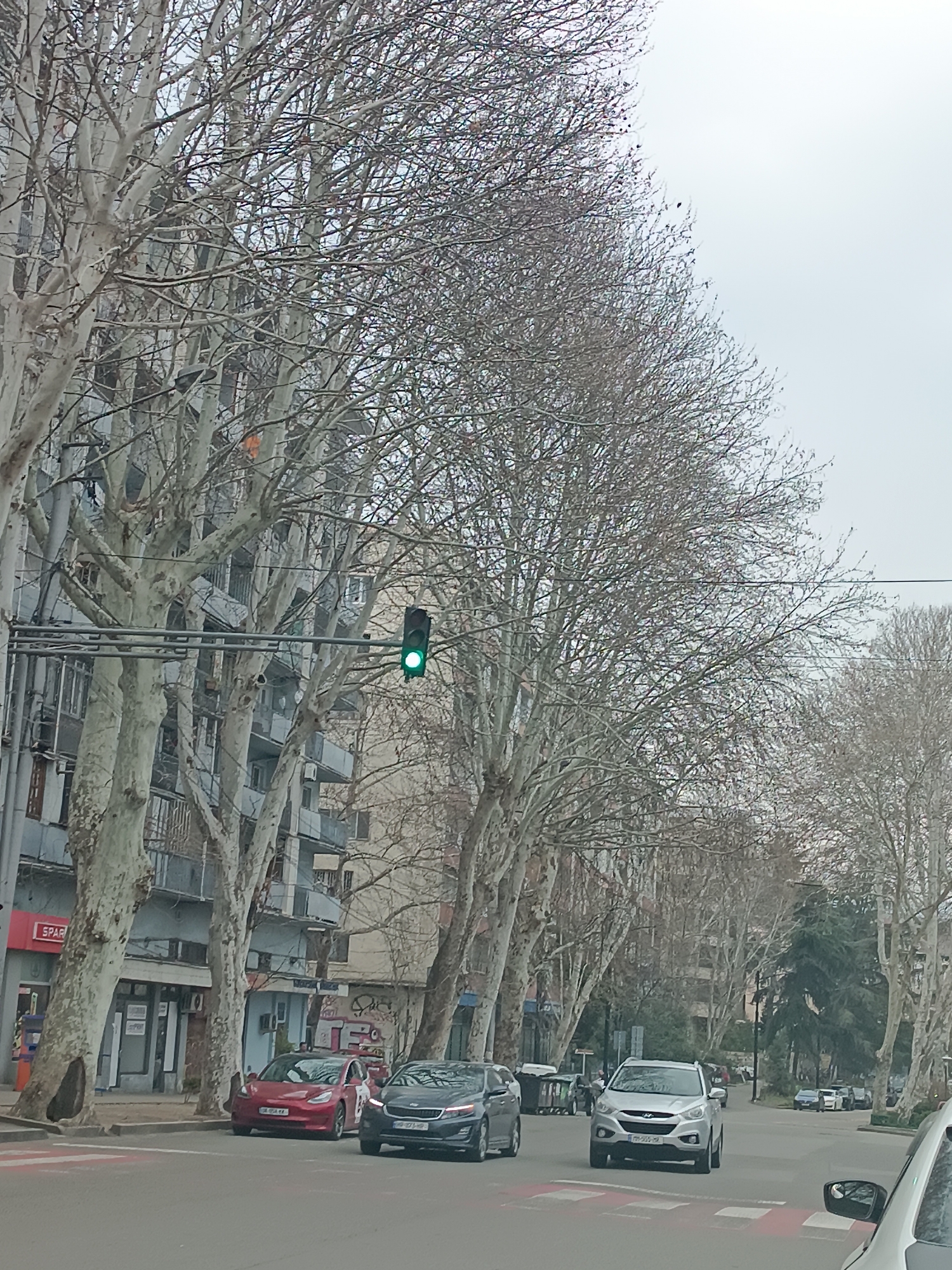 The image captures an urban street scene in Tbilisi, Georgia, specifically near a SPAR supermarket. The sky is uniformly overcast. The street is lined with numerous bare deciduous trees, likely Plane trees, which dominate the upper and mid-ground of the frame, obscuring portions of the multi-story buildings behind them. A green traffic light is illuminated, suspended over the multi-lane road in the mid-ground. The asphalt roadway features a pedestrian crosswalk marked with red and white stripes in the foreground. Several vehicles are present: * A partially visible white vehicle is in the immediate right foreground, indicating the viewpoint. * A red Tesla Model 3 sedan is parked on the left side of the street, partially on the sidewalk, adjacent to the SPAR store. * A black Kia Optima sedan is stopped in the right lane next to the red Tesla. * A dark gray Hyundai Tucson SUV is positioned in the left lane. * A silver Hyundai Tucson SUV is in the middle lane, facing towards the camera. * Additional vehicles are visible further down the street in the distance. On the left sidewalk, near the entrance of the SPAR store, one individual in dark clothing is partially visible. The multi-story buildings lining the street exhibit features such as balconies and external air conditioning units. Utility lines are visible suspended overhead. The scene suggests a winter or early spring day.