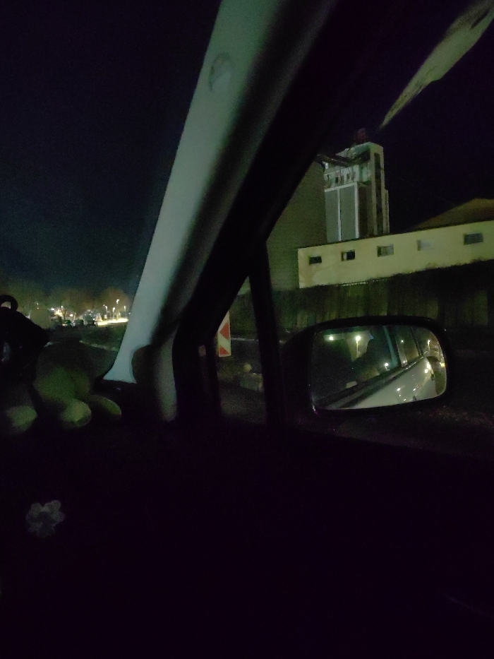 The image depicts a nighttime scene viewed from the interior of a vehicle, in Mezdra, Bulgaria. The upper left portion of the frame is dominated by a dark night sky. A light-colored A-pillar of the vehicle diagonally traverses the left side of the frame. Below the A-pillar, a light green, soft object, possibly a plush toy, rests on the vehicle's dashboard. A small, white, floral-shaped emblem or sticker is visible on a dark surface in the lower left. Outside the vehicle, on the left, multiple illuminated streetlights are visible among bare tree branches, suggesting a road or plaza. The right side of the image features external architecture: a light yellow single-story building with several small, dark rectangular windows is prominent. Above and behind this building, a taller, multi-story industrial structure with a grey-white facade rises prominently against the dark sky. This structure, consistent with the "Мелничката" (The Mill) landmark in Mezdra, displays complex mechanical components and a reddish element at its apex. A red and white striped traffic barrier or marker is partially visible on the ground to the right of the A-pillar. The passenger-side exterior mirror is present on the far right, reflecting blurred streetlights and a dark, indistinct silhouette of a person within the vehicle, along with the road surface. The overall environment is illuminated by artificial light sources against the dark night.