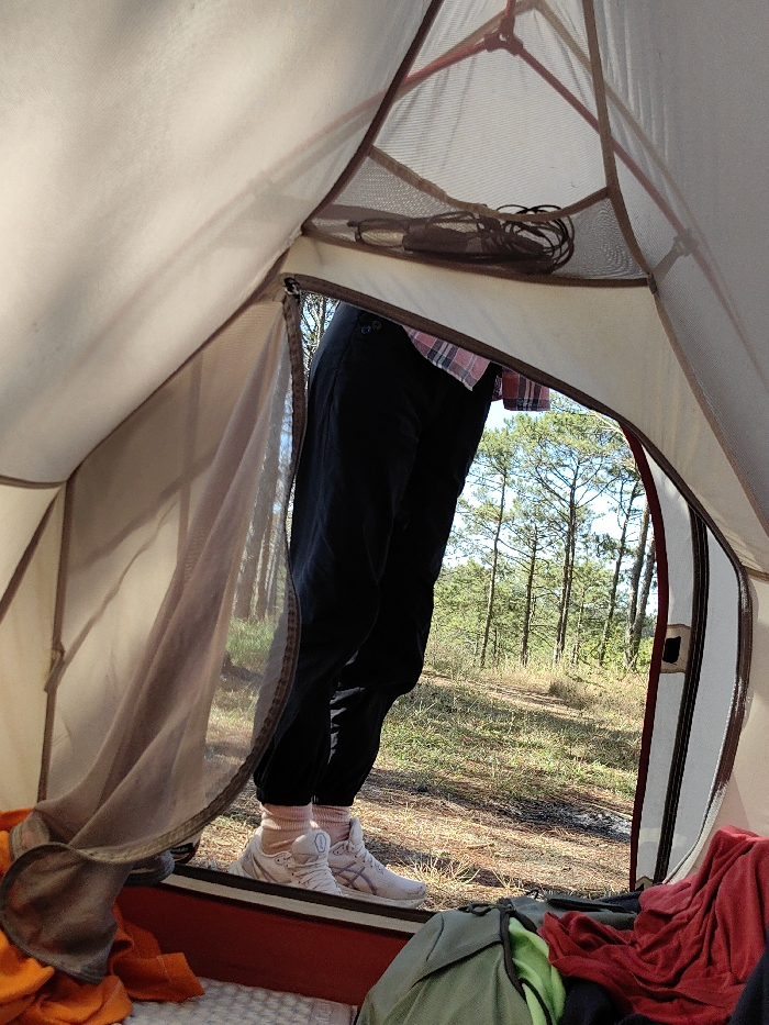 Inside a tent, a person wearing black pants, a plaid shirt, and pink socks with white sneakers stands near the entrance. The tent's mesh door is partially open, revealing a forest with tall pine trees and a sunlit clearing. A pair of glasses and a charging cable sit in a mesh pocket. Clothing and a backpack are strewn on the tent floor.