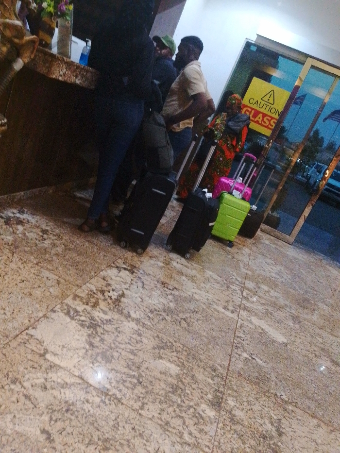 A group of people with suitcases stands in what appears to be a hotel lobby. The group waits near a reception desk, with several black suitcases placed in front of them. Behind them, a woman in a colorful headscarf and dress stands next to a green and a pink suitcase near a glass door with a "Caution Glass" sign. Outside, there is a parking lot with a couple of vehicles visible. The floor is tiled with large, speckled tiles.