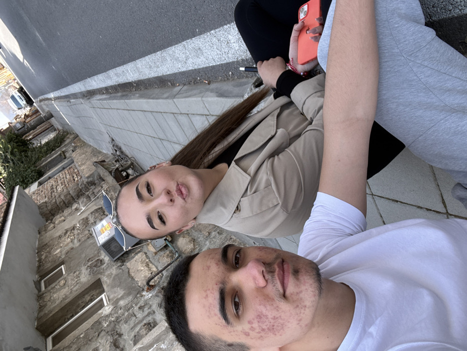 A selfie-style photograph depicts two young individuals, a male and a female, seated outdoors on a paved sidewalk bordering an asphalt road in Shumen, Bulgaria