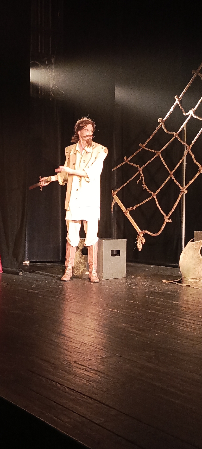 A male actor is depicted on a theatrical stage during a performance in Novoshakhtinsk, Russia