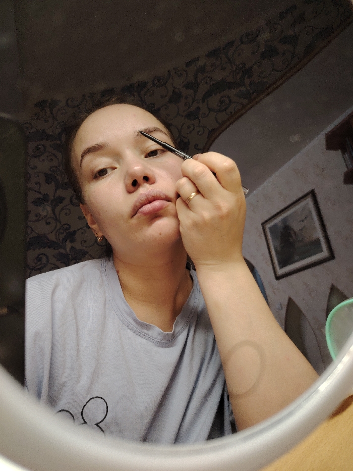 A woman applies eyebrow makeup, holding a pencil near her right eyebrow. She is fair-skinned with light brown hair, wearing a light gray T-shirt with a cartoon character on it. She has a ring on her hand. The photo is taken in a mirror, showing a room behind her with patterned wallpaper and a framed picture on the wall. Part of the mirror's frame is visible at the bottom.