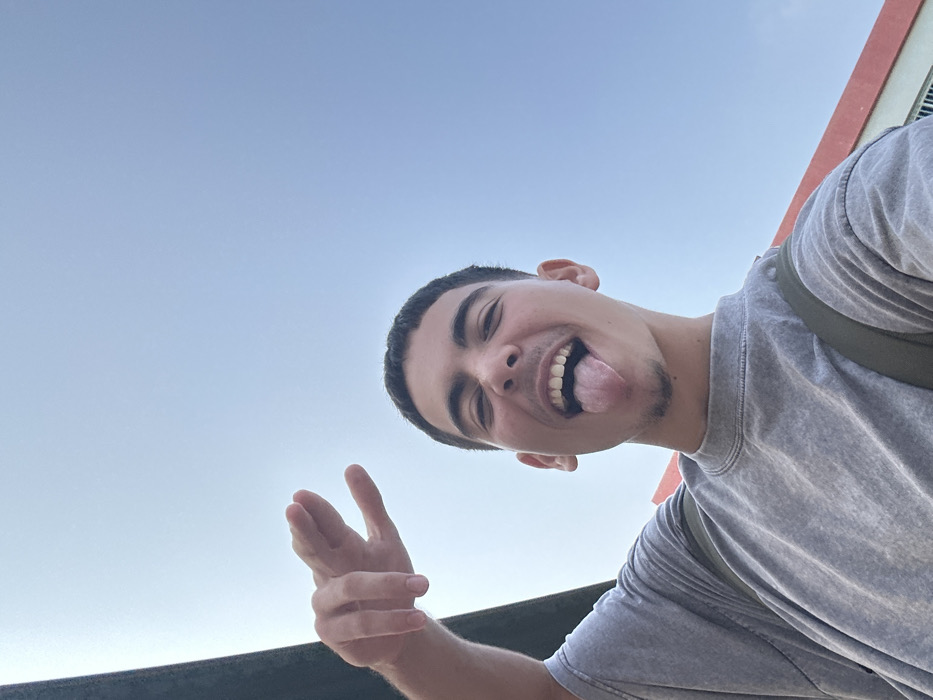 A young adult male is depicted in a low-angle outdoor photograph, positioned against a clear light blue sky. He possesses short dark hair, dark eyebrows, and minimal facial hair on his chin and jawline. His mouth is open in a wide smile, and his tongue is extended. His left hand is raised, forming a "V" gesture. He is wearing a light grey, textured long-sleeved shirt, and a dark olive-green strap, consistent with a backpack, is visible over his right shoulder. A dark structural element is present in the upper left of the frame. In the background to the right, a building with an orange-red upper section and a lighter-colored lower section featuring horizontal louvers or window bars is partially visible. The scene is located in Tel Aviv, Israel.