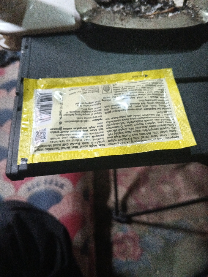 A single rectangular yellow foil sachet, identified by visible Indonesian text as "Tolak Angin" herbal medicine, lies horizontally on a dark, textured surface. The reverse side of the sachet, displaying a barcode, a QR code, and product information, is angled towards the viewer. In the upper right background, a partial view of a light-colored, circular ashtray containing dark ash and debris is present. The lower left background shows a blurred, multi-colored patterned surface, possibly fabric, featuring shades of red, pink, and blue. No individuals are visible. No explicit actions or interactions are depicted. The specific location within the city of Guadalupe, Philippines, cannot be determined from the visual evidence.