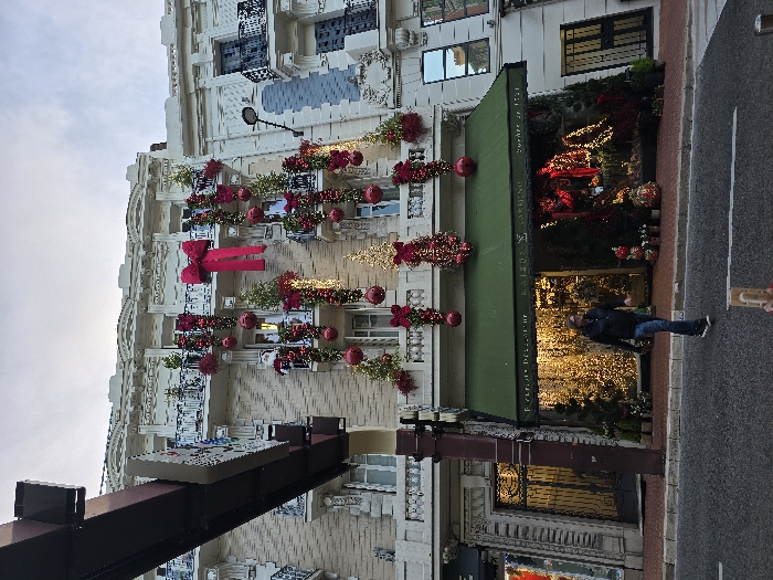 A decorated building facade is visible. Red ornaments, ribbons, and foliage adorn balconies and window ledges. A green awning covers part of the ground floor storefront. The storefront window is illuminated with golden lights and reflective surfaces. A man in a dark jacket is walking near the building. A street is to the side of the building.