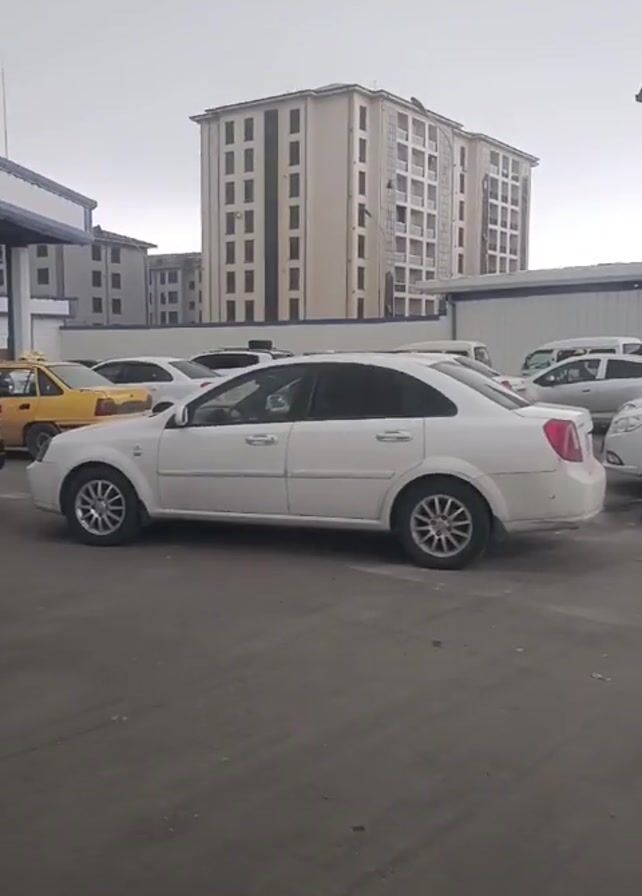 parking lot with multiple cars and a building with the word "METAN" in red letters on the side. The building is white with a blue stripe along the top. Several white cars are parked in the lot, along with a yellow taxi and a white van with yellow and black stripes. The video is taken on an overcast day. The camera appears to be moving slowly, possibly from inside a vehicle.