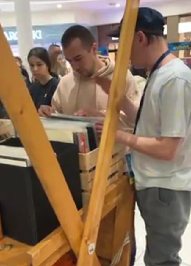 three people browsing vinyl records at a market stall. Two men are standing at the stall, looking through a crate of records. One man is wearing a light beige hoodie and the other is wearing a light blue t-shirt with yellow patterns, a dark blue cap, and a lanyard. A woman with dark hair is standing slightly behind them. The stall is made of wood and is filled with records in black sleeves. The background shows a mall environment with various shops and people walking around. The lighting is bright and artificial.