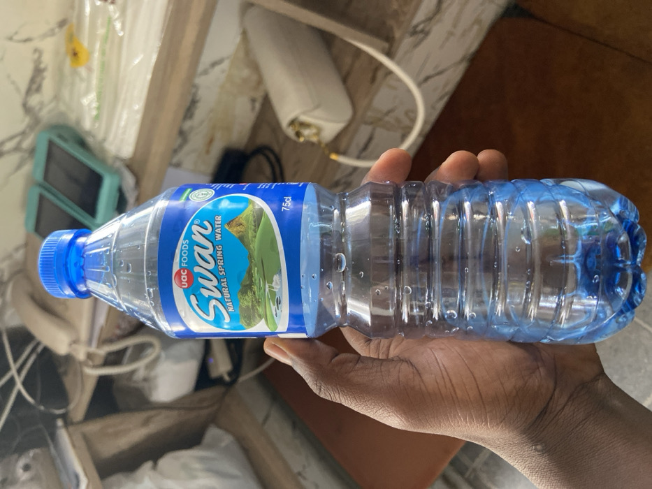 - "The image displays a dark-skinned human hand holding a partially full 75cl bottle of "UAC FOODS Swan Natural Spring Water" in Barakin Lerawi, Nigeria" by FM-43Jb23, licensed under CC BY 4.0