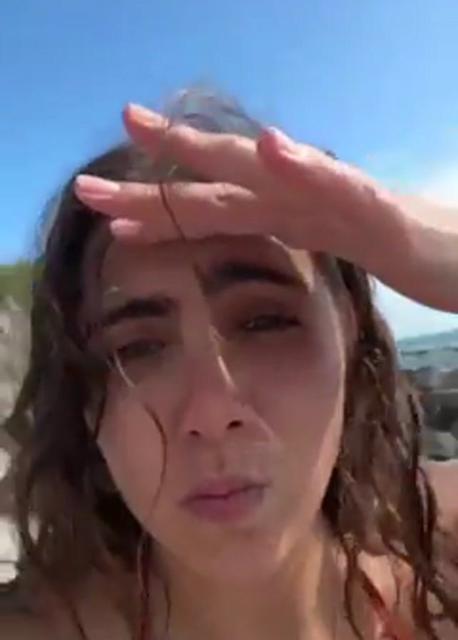 A young woman in a red bikini shields her eyes with her hand from the bright sunlight at the beach