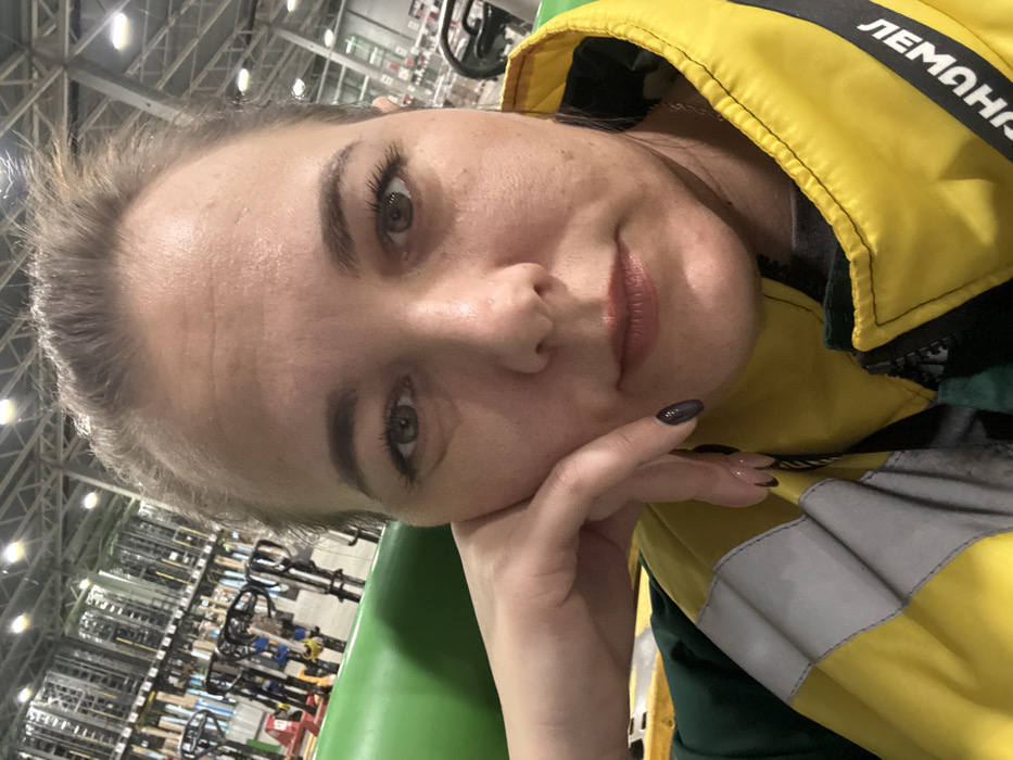An adult female is depicted in a medium close-up shot, gazing directly at the camera, against the backdrop of an industrial or large retail facility located in Lupanovo, Russia. Her hair, light brown, is pulled back, revealing a neutral facial expression. Her left hand, with dark nail polish, rests against her left cheek. She is dressed in a yellow high-visibility jacket featuring grey reflective strips, worn over a dark green uniform element and an underlying dark garment. A thin, gold-toned chain is visible around her neck. The background shows a vast interior space with high ceilings, exposed metal trusswork, and multiple overhead light fixtures. Rows of metal shelving units are visible, populated with numerous long, linear items. Several wheeled pieces of equipment are present on the floor. A large, curved, bright green structure occupies the lower left portion of the background. Partial, inverted Cyrillic text is present on the right side of the yellow jacket's collar.