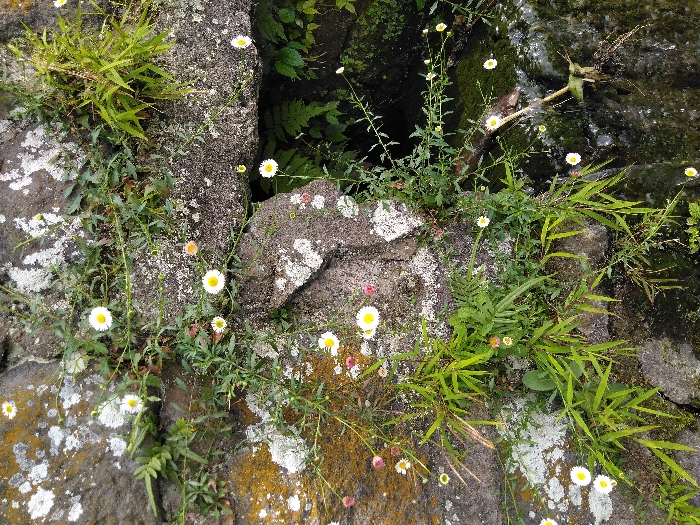 This image presents a detailed close-up of a rock formation bordering a natural water feature, situated in Phou Khoun, Laos. The scene is dominated by large, irregular dark grey rocks, extensively covered with patches of white, off-white, and yellowish-orange lichens. Numerous small, flowering plants with white petals and yellow central disks, consistent with daisy-like species, are scattered across the rock surfaces and growing from crevices. Interspersed among these flowers are various green plants, including clusters of narrow-leaved grass-like plants and broader-fronded ferns, particularly in the lower right and central-right sections. The bottom right portion of the image reveals dark, flowing water, likely a stream or small river, with visible light reflections on its surface. A light-colored plant stem or piece of wood is partially submerged in this water. No human subjects, animals, or artificial structures other than the rock formation itself are present.