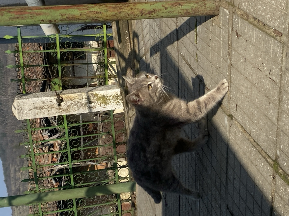 - "The image depicts a domestic short-haired cat walking from left to right across a sunlit, grey concrete paved surface in Arbanassi, Bulgaria" by FM-PFEbq2, licensed under CC BY 4.0