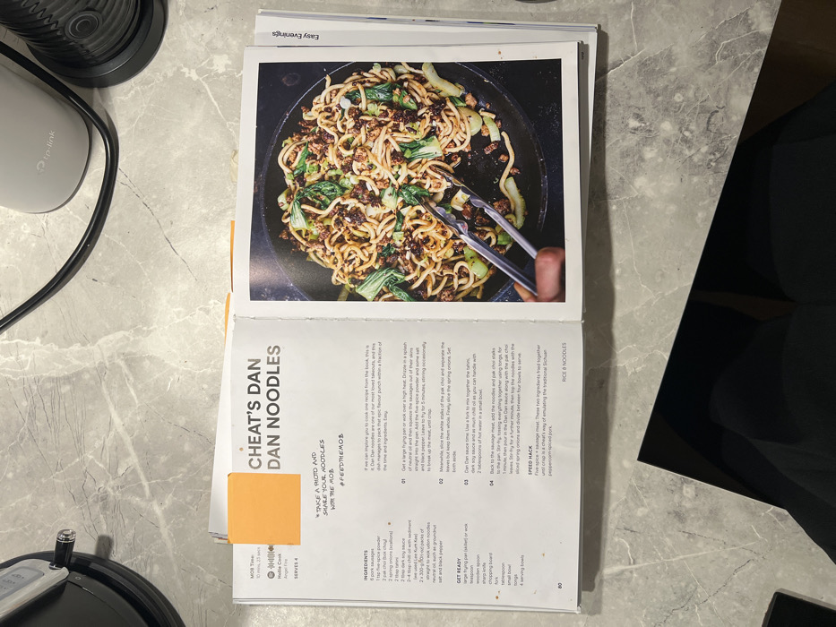 A cookbook is open to a recipe page for "Cheat's Dan Dan Noodles