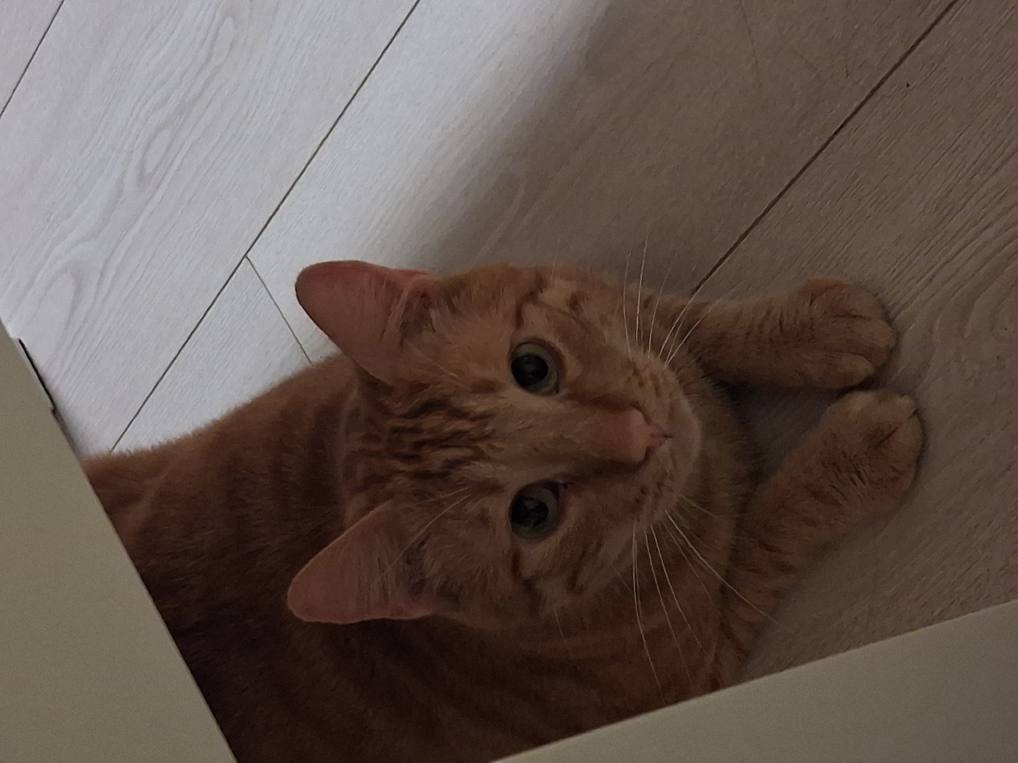 - "An orange tabby cat lies on a light-colored, planked floor" by FM-YYznh1, licensed under CC BY 4.0