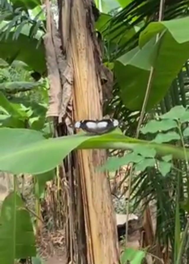 black and white butterfly sitting on a large green leaf in a tropical environment. The butterfly has symmetrical markings on its wings, and its wings are spread open. The leaf is part of a plant with a thick, brown trunk, possibly a banana tree. Other lush green foliage surrounds the main subject, creating a dense backdrop. The camera zooms in slightly to get a clearer view of the butterfly. The butterfly is still, with its wings spread, as if basking in the sun. There is a voice in the background, indicating the presence of a person observing the butterfly.