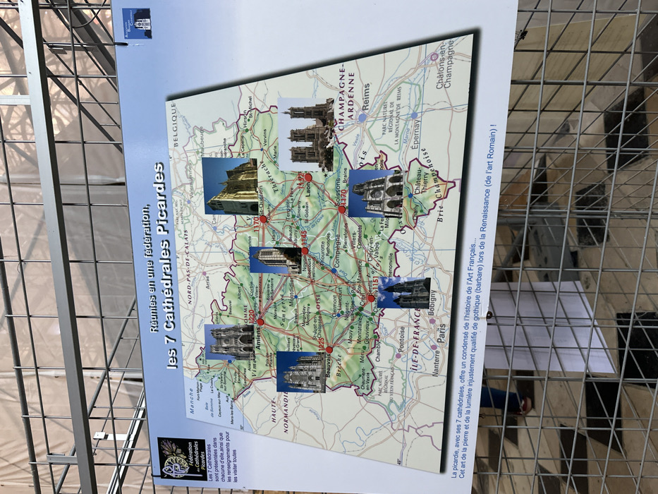 A large, rectangular educational poster, oriented vertically, is displayed outdoors, partially obscured by a metal grid fence in the foreground. The poster presents a map of the Picardy region of France, titled "Réunies en une fédération, les 7 Cathédrales Picades" (United in a federation, the 7 Picardy Cathedrals). The map delineates departmental boundaries, major cities, and connecting routes. Seven photographic images of prominent Gothic cathedrals are superimposed over their respective locations on the map, including Beauvais, Amiens, Laon, Noyon, Saint-Quentin, Senlis, and Soissons. Red circular markers with numeric labels indicate specific points of interest. The upper left corner features the logo for "Fédération des 7 Cathédrales Picardes" alongside explanatory French text, while the upper right displays an "Association Cathédrales" logo. The bottom portion of the poster contains a block of French text discussing the historical and artistic significance of these cathedrals. The poster is attached to a light-colored background, possibly a wall or temporary structure. The metal grid fence, composed of intersecting horizontal and vertical bars, occupies the lower and central foreground, casting shadows and partially blurring the lower half of the poster and the background. Through the grid's openings, a paved ground surface is visible, and the lower legs of a person, wearing dark trousers and red-soled footwear, are discernible in the bottom-left corner, standing behind the grid. The scene is located in Beauvais, France.