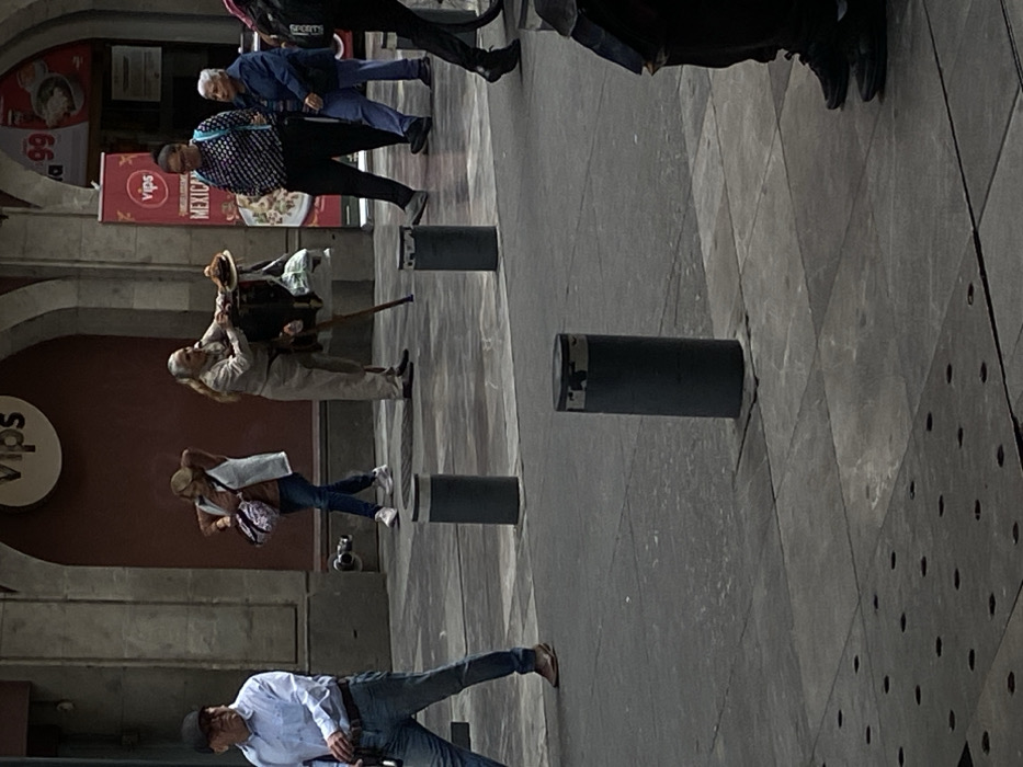 The image depicts a bustling urban street scene in Mexico City, Mexico. In the mid-ground, a male street performer, identified as an organ grinder, stands centered, facing right. He possesses long, light-colored hair and wears a tan-colored two-piece outfit. He is positioned behind a dark, tripod-mounted barrel organ, which has a small brown hat placed on its top and a green bag hanging from its side. To the left of the organ grinder, a middle-aged male walks from left to right, wearing a light blue long-sleeve shirt, blue jeans, brown shoes, and a dark baseball cap. His left arm is slightly bent. Behind him, a middle-aged female walks in the same direction, wearing a brown top, a light-colored vest, blue jeans, and white sneakers, carrying a patterned shoulder bag. Her right arm is raised, possibly adjusting her hair. To the right of the organ grinder, a middle-aged female walks from left to right, wearing a dark patterned long-sleeve shirt and dark pants, with a blue backpack. Behind her, an older female walks in the same direction, dressed in a blue jacket and light-colored pants. In the far right foreground, only the lower legs and dark shoes of another person, walking right to left, are visible. The background features a building facade with prominent arched sections. A circular white sign with the red "Vips" logo is visible, indicating a Vips restaurant. Below this, a red vertical banner advertises "MEXICAN" cuisine with food imagery and the number "99". A silver-colored fire connection point is visible on the building wall in the middle-left. The street is paved with grey flagstones, interspersed with darker sections and lines. Three dark grey bollards with silver tops are installed in the mid-ground, separating parts of the pedestrian pathway. A metal grate with circular perforations is visible in the lower-left foreground. The scene is illuminated by ambient light, suggesting daytime conditions.