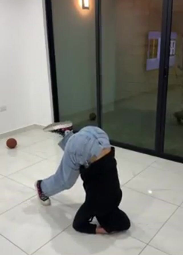 person indoors in a yoga position. The person is kneeling on a white tiled floor. They are wearing a black hooded sweatshirt, blue jeans, and sneakers. Their head is on the floor. Their legs are slightly bent, and they appear to be trying to maintain their balance. In the background, there is a sliding glass door with a light fixture on the wall to the left of the door. Outside the door, there is a stone wall and some greenery. In the room, there is also a small basketball on the floor to the left of the person. The video has a static shot and natural lighting.