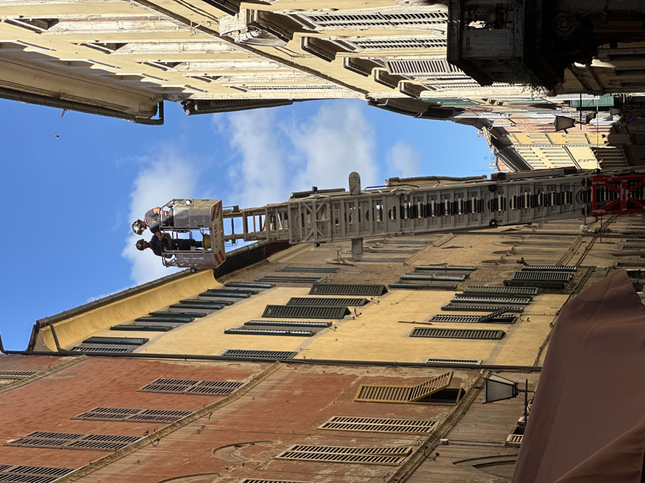The image captures an upward view of a narrow street in Siena, Italy, flanked by tall, multi-story buildings. A multi-sectioned mechanical ladder, extending diagonally upwards from the street level, is centrally prominent. At the ladder's apex, two individuals, identified by their protective helmets and dark uniforms, stand within a metal work platform. One individual appears to be engaging with the other, possibly gesturing or conversing. The building on the left features a yellow facade with reddish-orange sections, exhibiting multiple windows fitted with dark green louvered shutters, some closed, others partially open. A black, ornate street lamp is affixed to this building at a lower level, and a reddish-brown awning is partially visible at the bottom of the frame. The building on the right displays a lighter, cream-yellow facade, also with multiple shuttered windows, and includes a small, ornate stone balcony on its upper floors. The sky above is a bright blue with scattered white cumulus clouds. A small, dark, unidentified object is visible in the sky above the buildings in the upper right quadrant. The lower portion of the street is largely obscured by the base of the ladder apparatus.