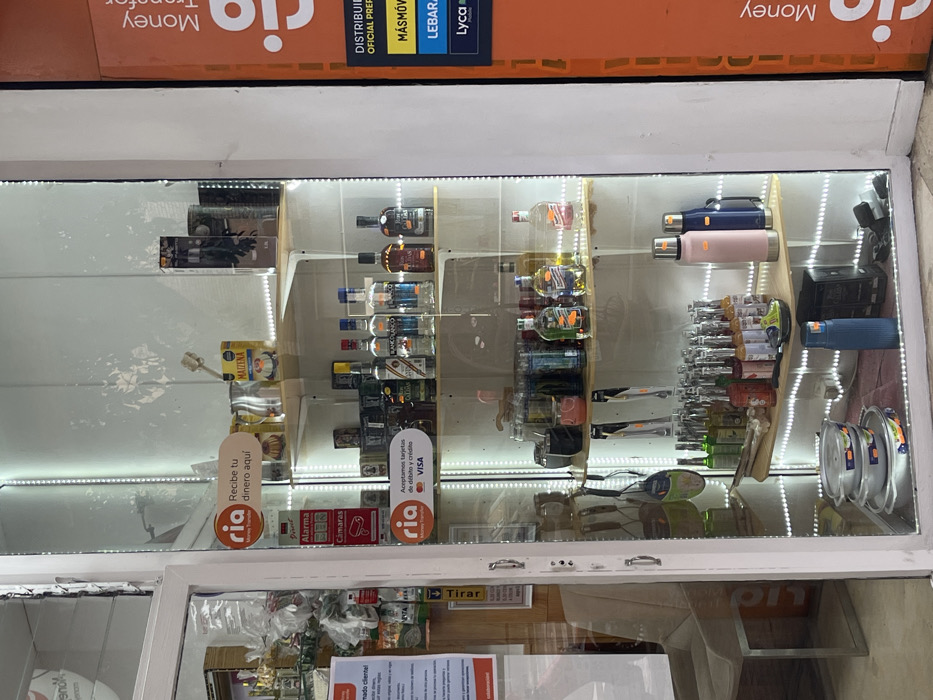 The image displays a brightly lit glass display case within a small commercial establishment in Valencia, Spain