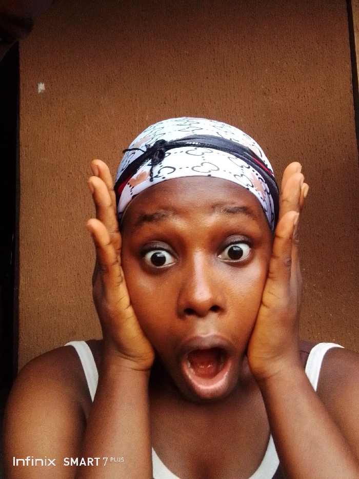 A young woman with brown skin and a headscarf appears to be surprised or shocked. Her eyes are wide, mouth open, and hands are on her cheeks in a classic "shocked" expression. She is wearing a white tank top. The background is a plain brown wall. The text "Infinix SMART 7 PLUS" is in the bottom left corner.