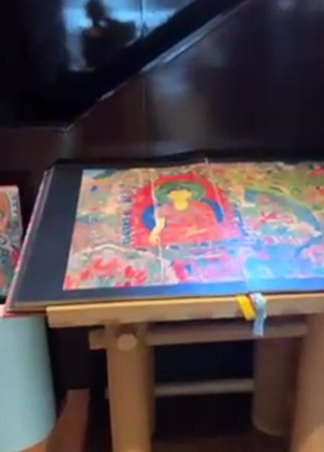 person walking past a small wooden table. On the table is a large book or binder with colorful artwork on its cover. Next to the table is a light blue cylindrical object with a picture on it. A dark paneled wall is visible in the background, and a dark wooden floor is under the table. The person walks from left to right across the frame. After the person passes, the camera angle shifts to show a table with papers and a camera on it. Finally, the view moves up to show a light fixture.