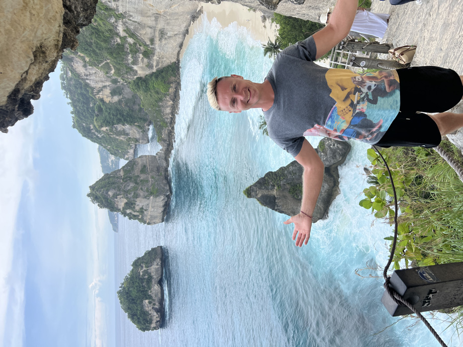 A fair-skinned man with blonde hair stands beside a steep cliff overlooking a turquoise ocean with rocky islands