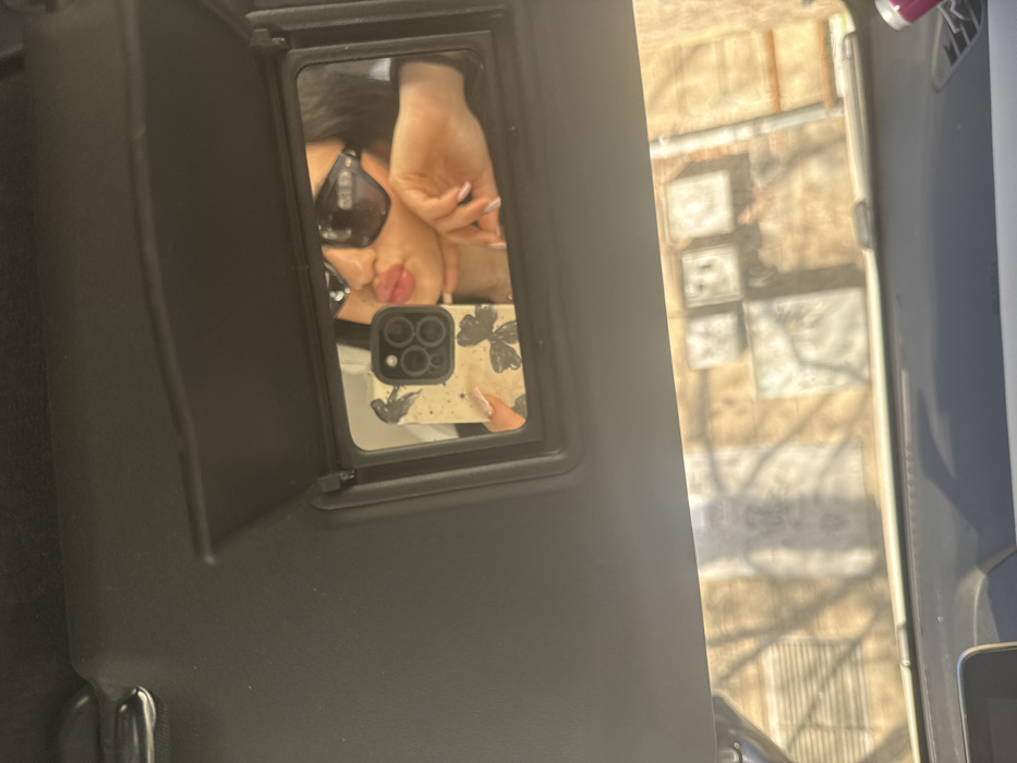 The image depicts the interior of a vehicle, specifically focusing on the passenger-side sun visor, which is lowered and features an illuminated vanity mirror. Reflected in the mirror is a person, likely female, taking a selfie. The individual wears dark-framed sunglasses, has dark hair, and is making a "pout" or "duck face" with pink-glossed lips. Their left hand is visible holding an iPhone, identifiable by its multiple camera lenses. The phone case is a light cream or beige color with dark, possibly black, floral or butterfly patterns. The nails on the visible fingers are manicured with a light, possibly ombre or French tip, design. The person's right hand rests under their chin. Below the sun visor, through the vehicle's windshield, an exterior scene is visible but blurred. This scene shows the facade of a light-colored building, possibly stucco or concrete, featuring several square or rectangular elements, some with discernible patterns like crosses or circular motifs. Shadows of bare tree branches are cast across the building facade, indicating direct sunlight. The specific location within the city of Ruse, Bulgaria, cannot be determined from the visual information provided in the image.