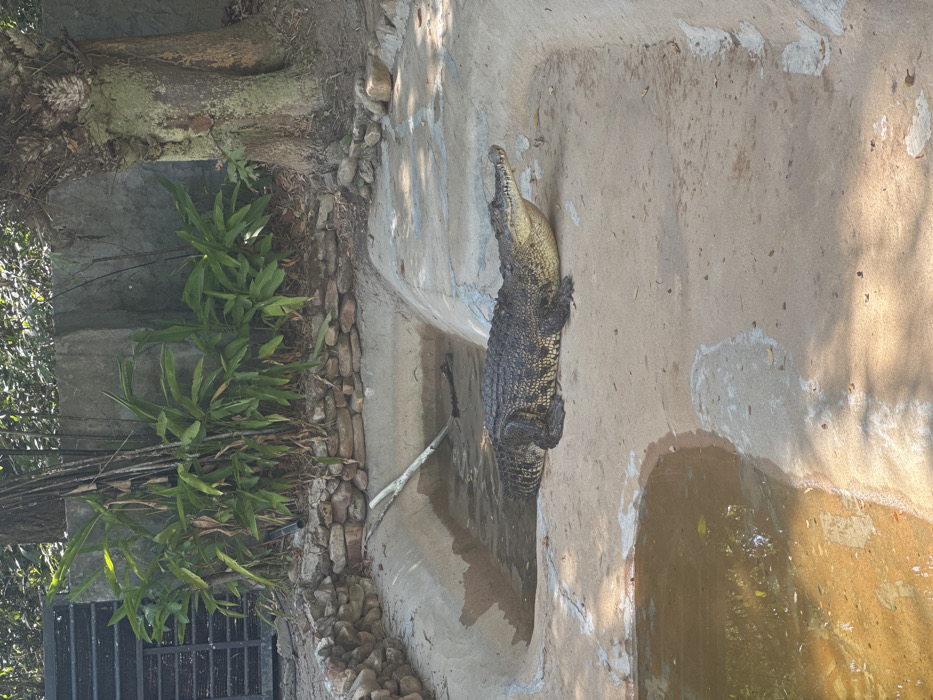 - "A large, dark-skinned crocodile rests on a textured concrete surface within an outdoor enclosure, its head oriented towards the right" by FM-xTDQG2, licensed under CC BY 4.0