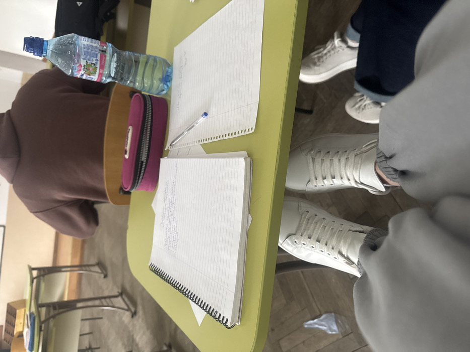 This image depicts an interior view of a classroom in Zlatograd, Bulgaria, observed from a seated perspective. In the immediate foreground, a person's legs are visible, clad in light grey sweatpants with cuffed ankles, and white lace-up sneakers. To the right, another pair of feet in light grey sneakers, covered by dark blue trousers, are partially visible under the desk. The desk surface, colored lime green, supports various items. On the left, an open spiral-bound notebook with ruled pages contains handwritten text. To its right, a blue ballpoint pen rests on a separate, blank sheet of ruled paper. Behind these items, a dark pink zippered pencil case is present, positioned next to a transparent plastic water bottle with a blue cap, partially filled with liquid and exhibiting condensation. In the mid-background, the back of an individual wearing a brown hooded sweatshirt is visible, seated at a light brown wooden desk and chair. Additional classroom furniture, including desks with metal frames, extends into the background. The floor features light-colored wooden planks. A crumpled white object, possibly paper or plastic, is visible on the floor near the foreground sneakers.
