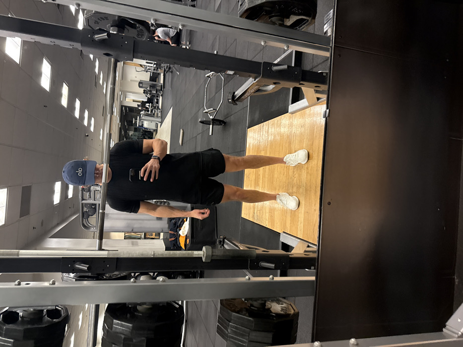 In a gym setting, a man with a blue cap, black shirt, and black shorts stands on a wooden platform facing a mirror. He is holding a phone, presumably taking a picture. The gym equipment includes a squat rack with weight plates loaded on it, along with other exercise machines in the background. The lighting is bright, with natural light coming through the windows.