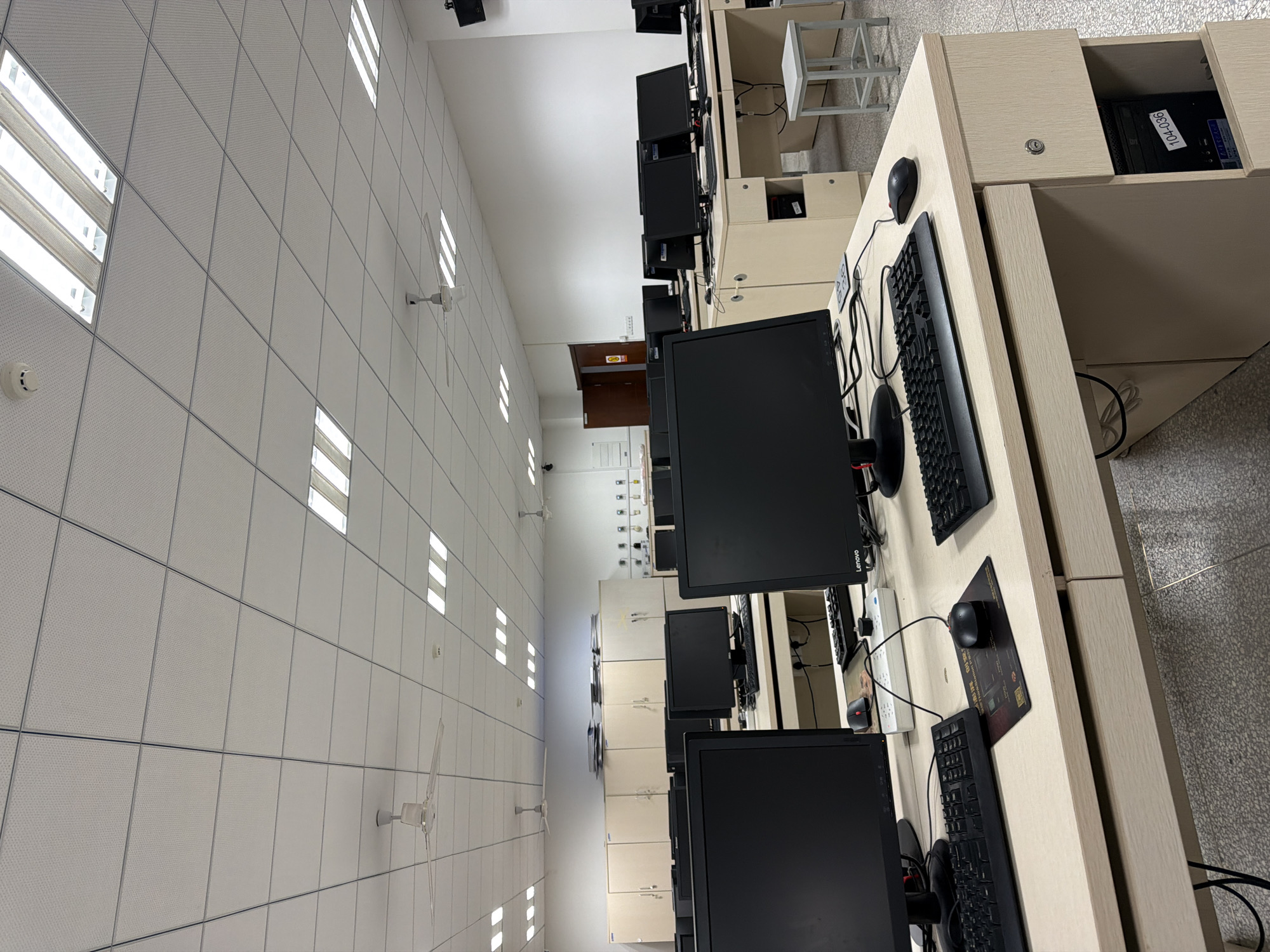 computer lab in a building with rows of computers on desks