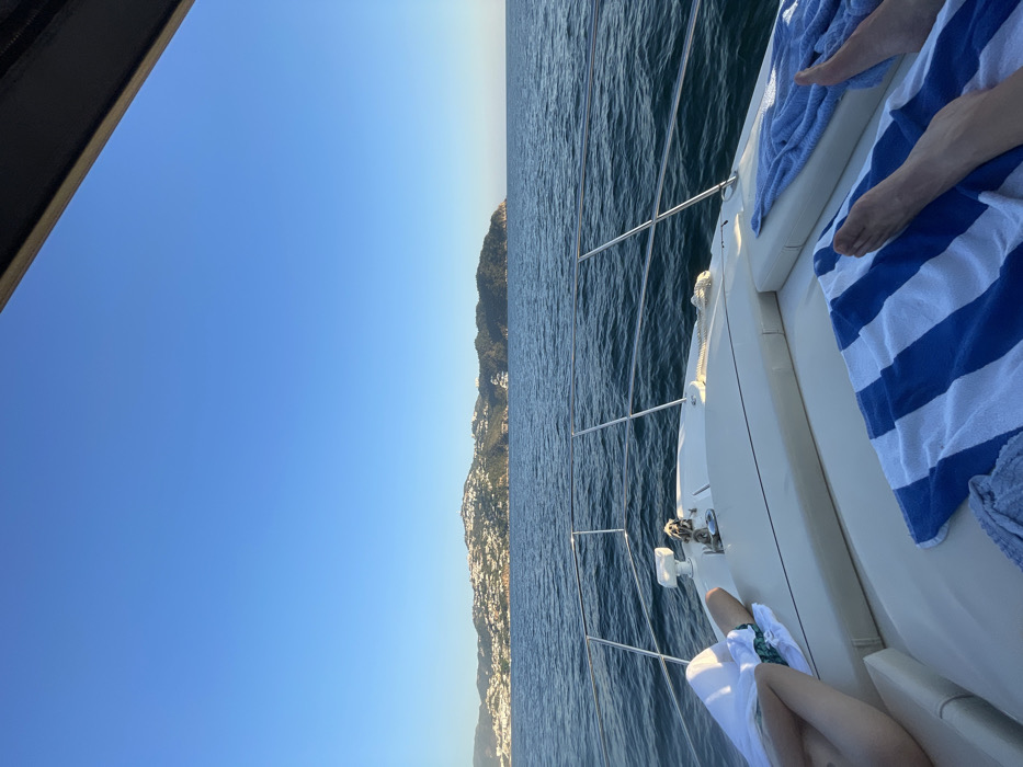 A horizontal view from a boat on the water, with a clear blue sky above and a shoreline dotted with buildings in the distance. The boat's railing is visible, along with glimpses of people relaxing on the deck, their legs and towels partially visible. The water is calm, reflecting the sunlight.