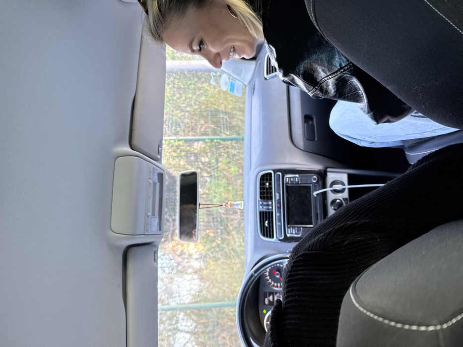 The image captures the interior of a vehicle, viewed from a rear passenger seat. A blonde female individual, smiling broadly and looking towards the right, occupies the front passenger seat. She wears a shiny black jacket and light blue jeans, with a gold hoop earring visible on her left ear. The driver is partially visible on the left, wearing a black ribbed top, with hands on the steering wheel. The vehicle's dashboard features a steering wheel, an instrument cluster displaying "23:55," a central infotainment system, and climate controls. A white USB cable extends from below the infotainment screen. A small hanging ornament is suspended from the rearview mirror. Through the front windshield, a daylight scene reveals a chain-link fence in the mid-ground, backed by dense green and brown foliage. The specific location within Cannes, France, cannot be determined from the visual evidence.