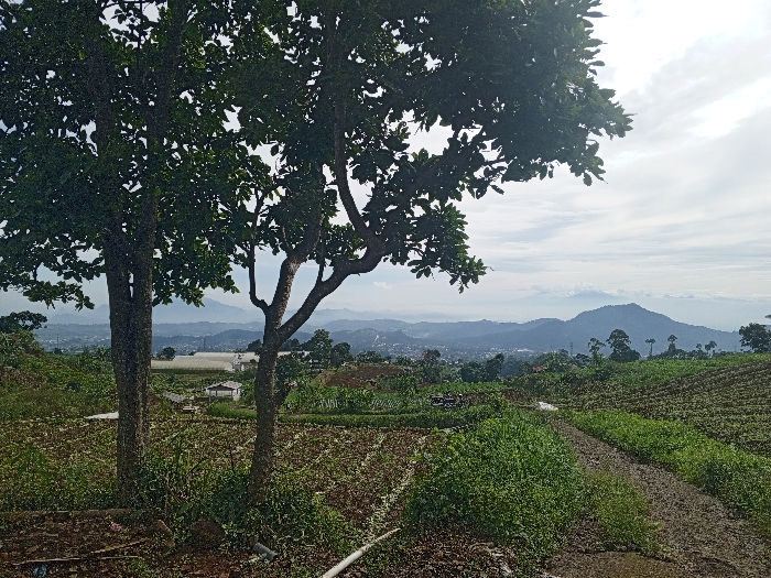 A tranquil landscape features lush greenery, including two prominent trees in the foreground. Beyond, cultivated fields with orderly rows stretch toward a distant cityscape nestled amongst rolling hills and mountains beneath a cloudy sky. The scene evokes a sense of peaceful rural life, with a glimpse of urban activity in the distance. A greenhouse structure is also visible.