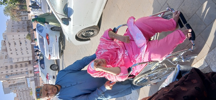 A man pushes a woman in a manual wheelchair on a paved outdoor surface in Medina, Saudi Arabia