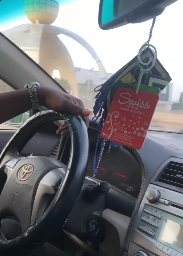 view from inside a Toyota Camry car as it drives down a street. The driver's hand is visible on the steering wheel. An air freshener hangs from the rearview mirror. Through the windshield, there's a large monument with a golden sphere on top. As the car moves, the camera pans slightly revealing buildings, one labeled "REVENUE HOUSE".