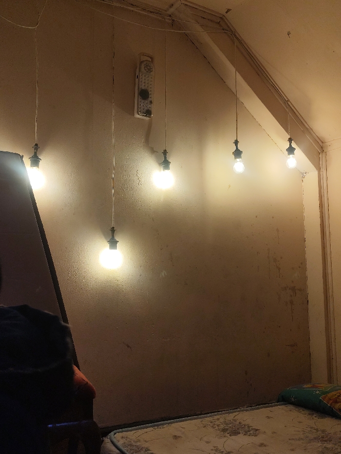 A dimly lit room features a bed and a person seated in a chair, silhouetted. The textured wall is adorned with a row of hanging lightbulbs, each suspended from a single cord. The lights cast a soft, warm glow. Near the center of the wall, an old-fashioned, cream-colored electrical outlet is visible. The room's design evokes a vintage or rustic aesthetic.