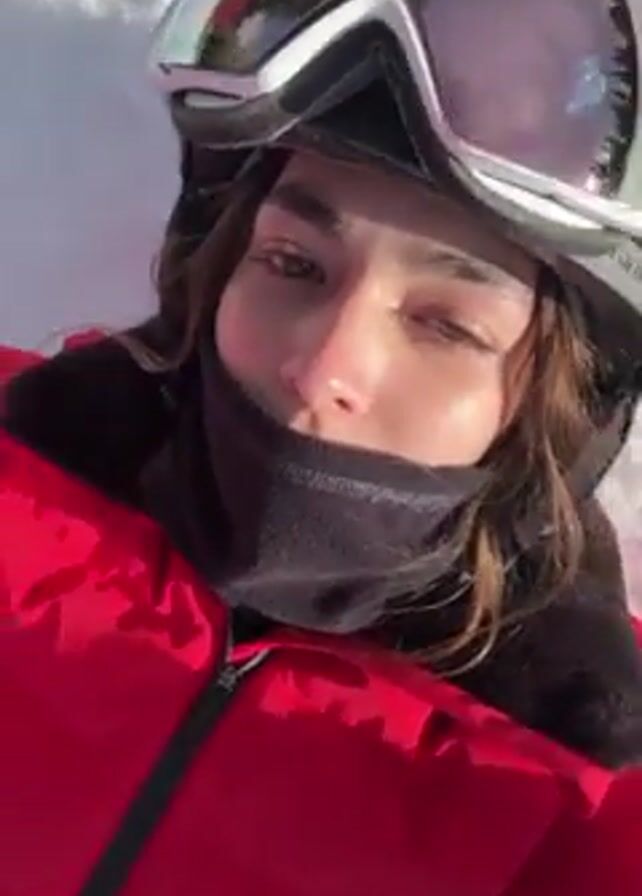 A person wearing a red winter coat, white ski helmet with goggles, and a black neck warmer is lying in the snow. The person extends one arm out to the side, and skis are visible next to them. The video is taken from above, capturing the person's face and upper body against the white snow. The weather appears sunny.