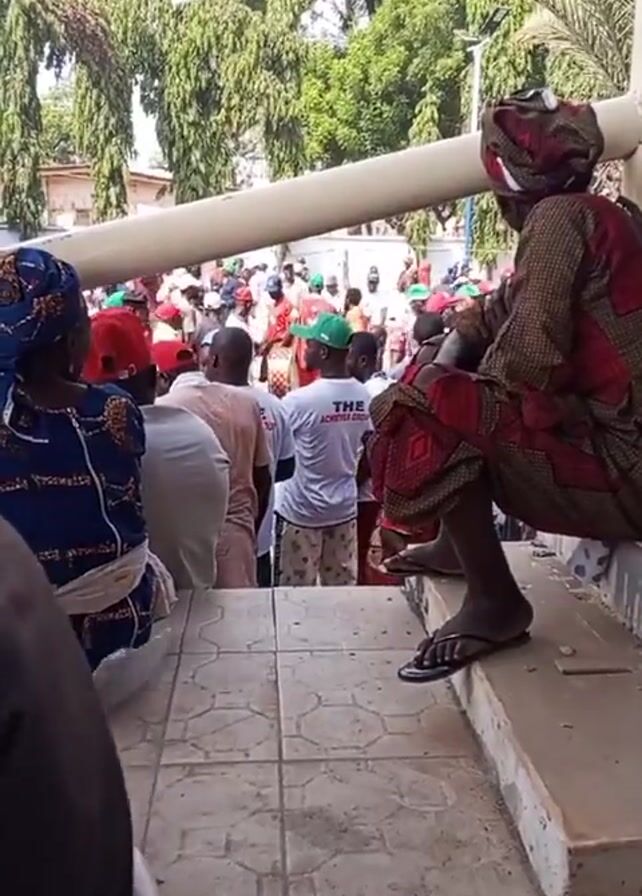 crowd of people standing in a courtyard. Two women are sitting on steps watching the crowd. The woman closest to the camera is wearing a patterned, long-sleeved dress, a head wrap, and flip-flops. The other woman is wearing a blue dress with white stripes. In the background, many of the people in the crowd are wearing hats, some of which are red and some of which are green. A man in a white shirt with the words "The Achievers Group" on the back is visible in the crowd. Trees are visible in the background, and the setting appears to be outdoors on a sunny day.
