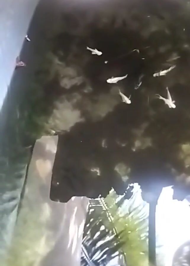 dark, possibly outdoor, fish tank with several small, pale fish swimming. The water appears murky, with a dark bottom possibly covered in algae or debris. The camera is positioned above, looking down into the tank. The tank is not particularly clear, and the surrounding environment is blurry but suggests foliage and possibly a building.