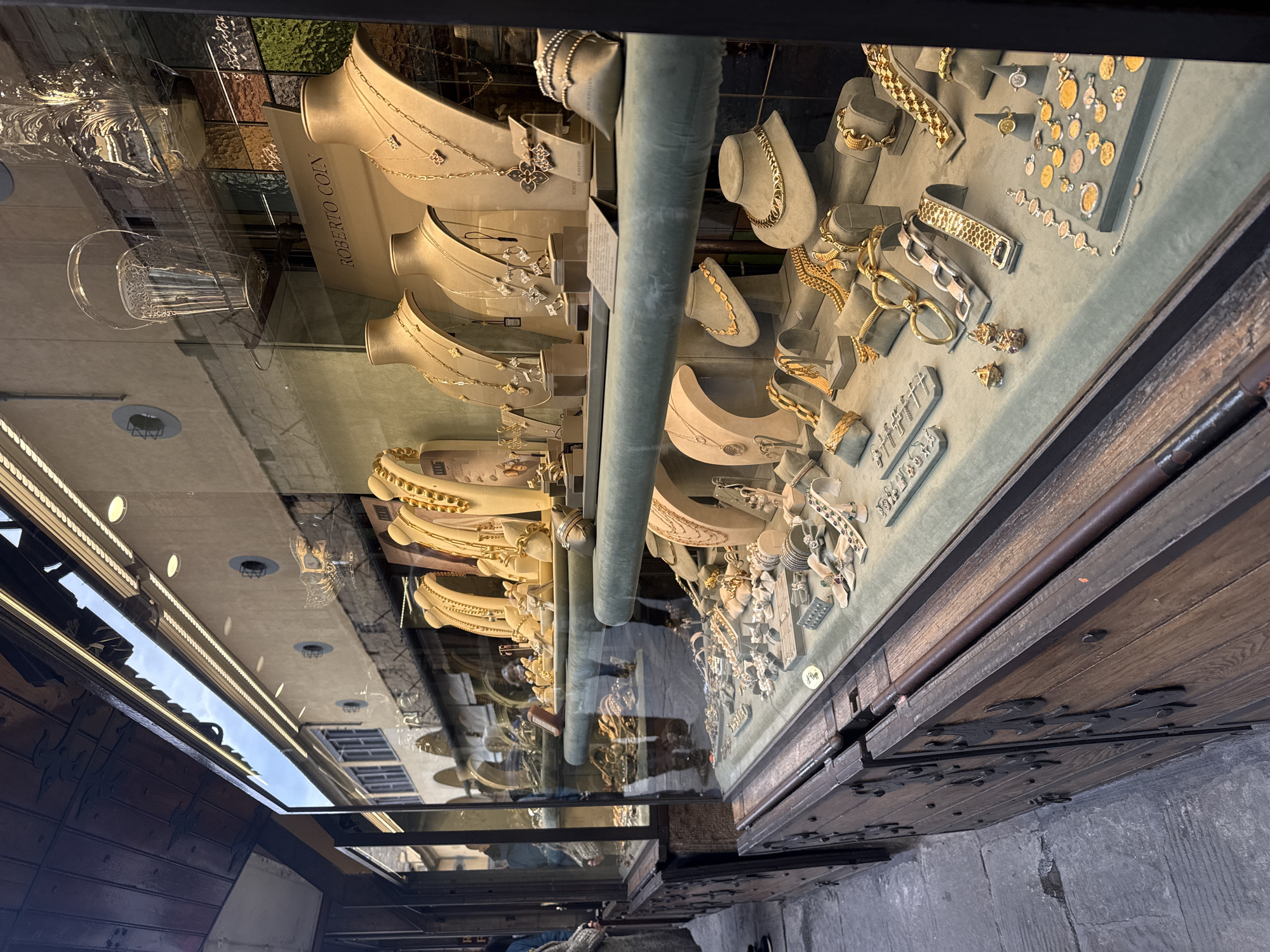 This image captures a street-level view of a jewelry store display window on the Ponte Vecchio bridge in Florence, Italy