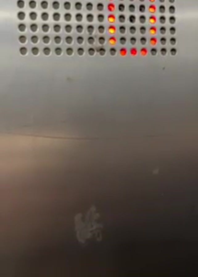 close-up of a metal surface with a perforated panel containing red LED lights. The lights illuminate sequentially, spelling out the word "LOADING". The metal surface has a few scratches and a faint, faded mark or stain near the bottom. The environment appears to be indoors, possibly inside an elevator or similar enclosed space. No people are visible.